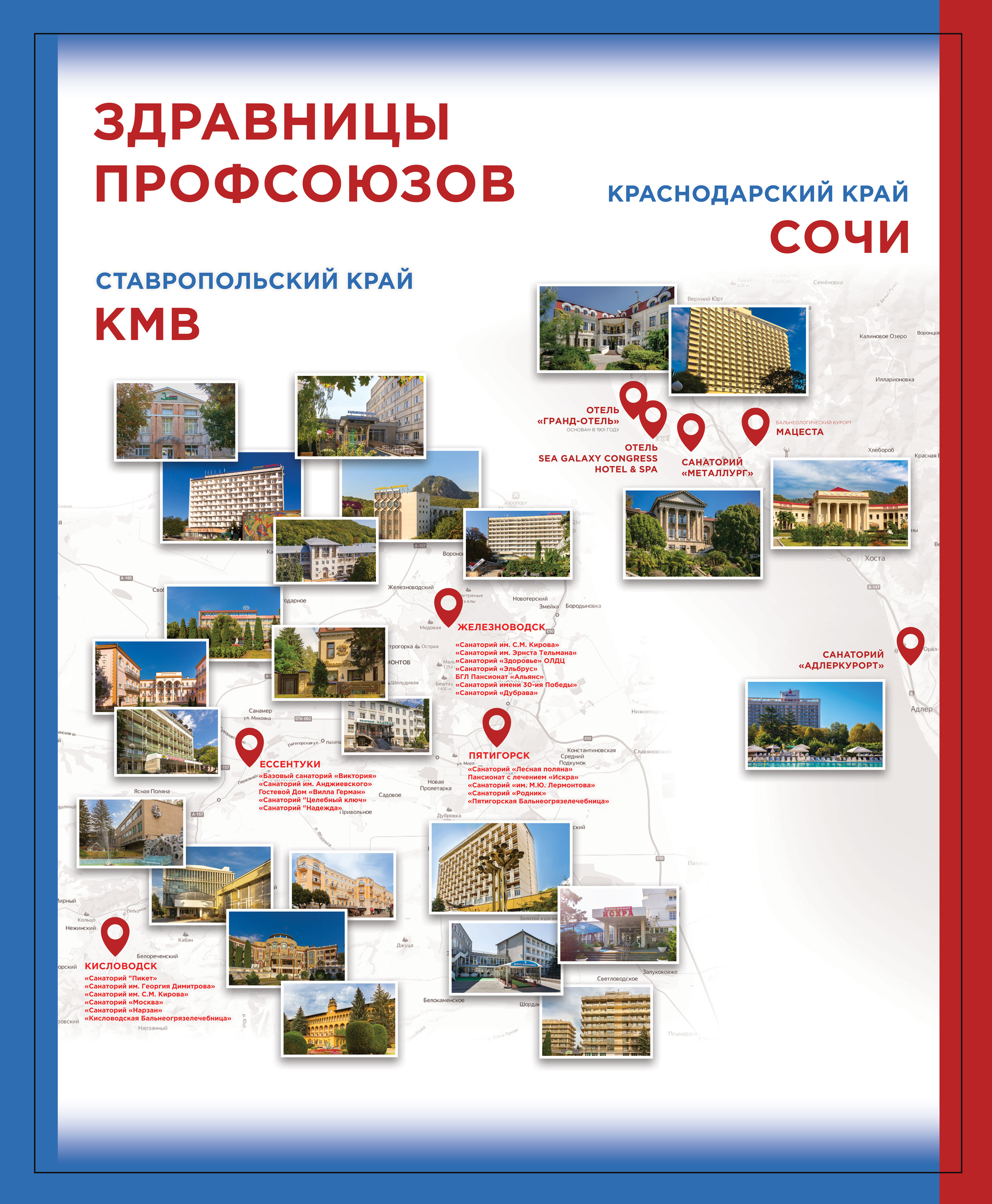 Главное ядро деятельности компании составляют 22 профсоюзных многопрофильных лечебно-профилактических учреждения в регионе Кавказских Минеральных Вод, несколько из них имеют статус реабилитационных центров, и 5 крупных курортных объекта в Сочи.